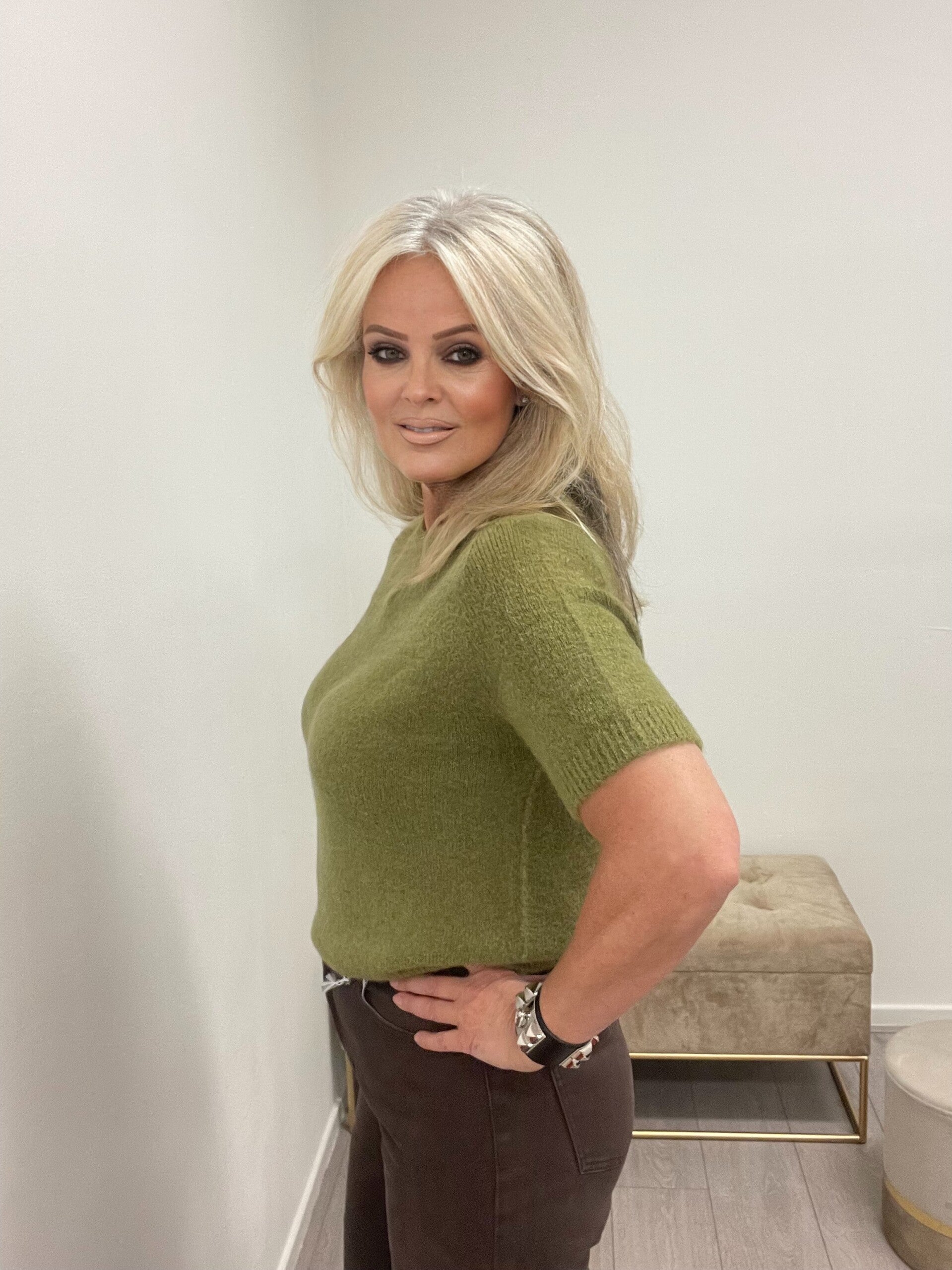 Zacht gebreide top in olive green. Met korte mouwen en een ronde hals.