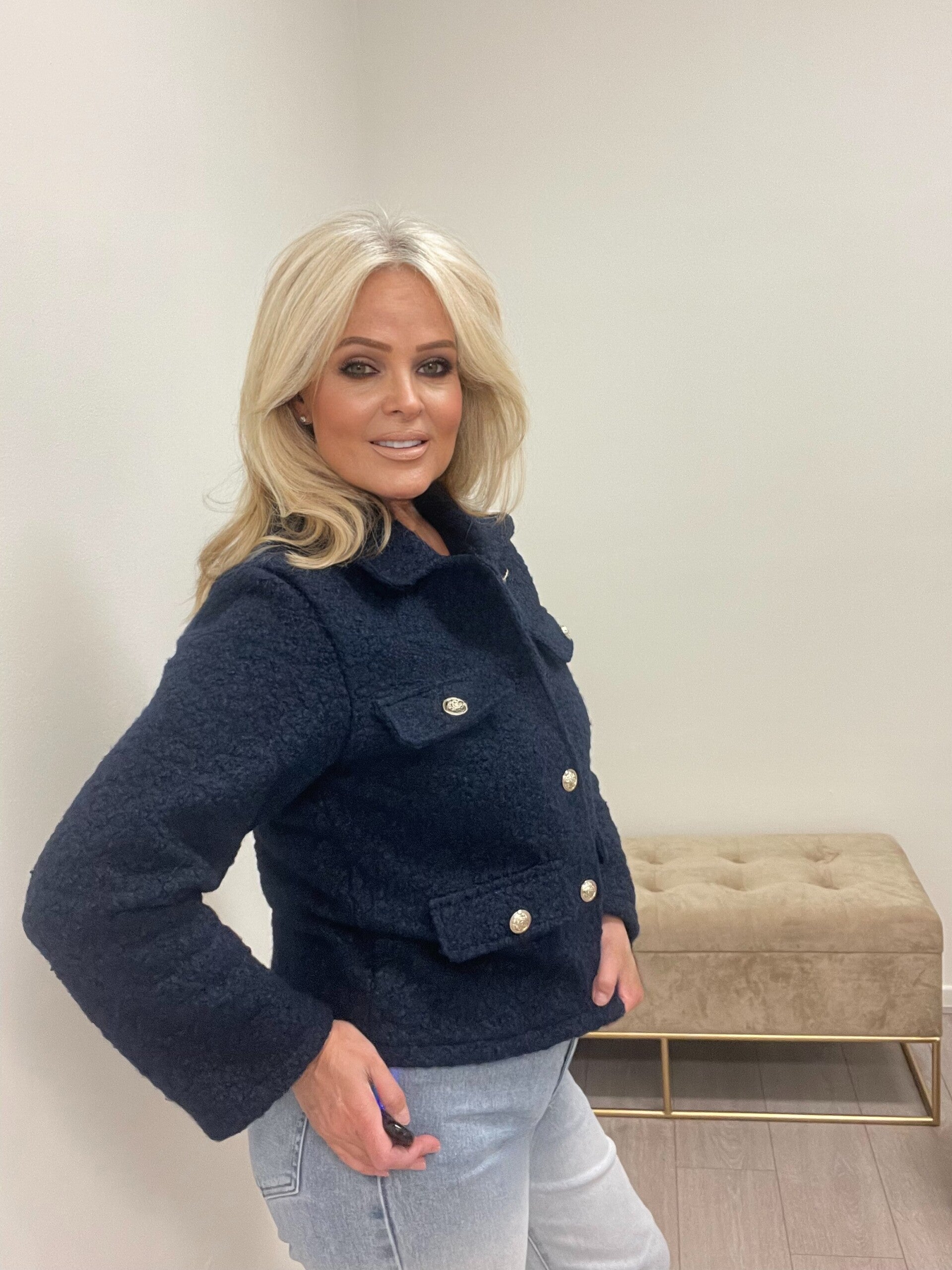 Een heerlijk zacht jasje te dragen als vest. Met nep zakjes en gouden knopen.